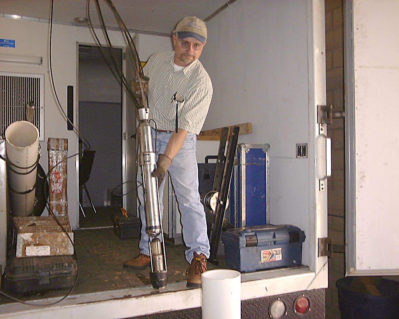 Technician displaying the 4" downhole radial view camera, winch and tool storage in the climate controlled dogbox.